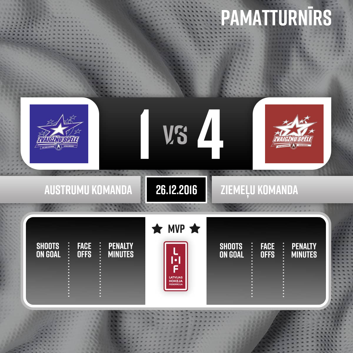 Goal#71 Raimonds VILKOITSAssist: #17 Elviss ŽELUBOVSKIS - 00:00P1Spēle starp komandām Austrumi un Ziemeļi ir sākusies