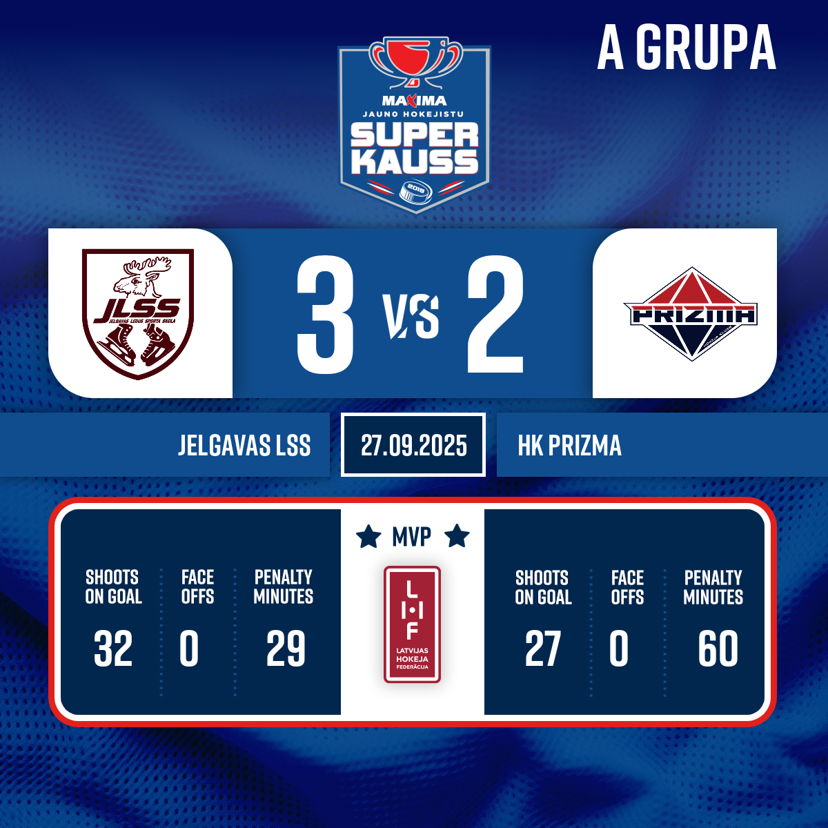 Powerplay goal#26 Marks JERMAKOVSAssists: #88 Ralfs LĪCIS, #9 Kristiāns MELBĀRDIS - 00:52P1