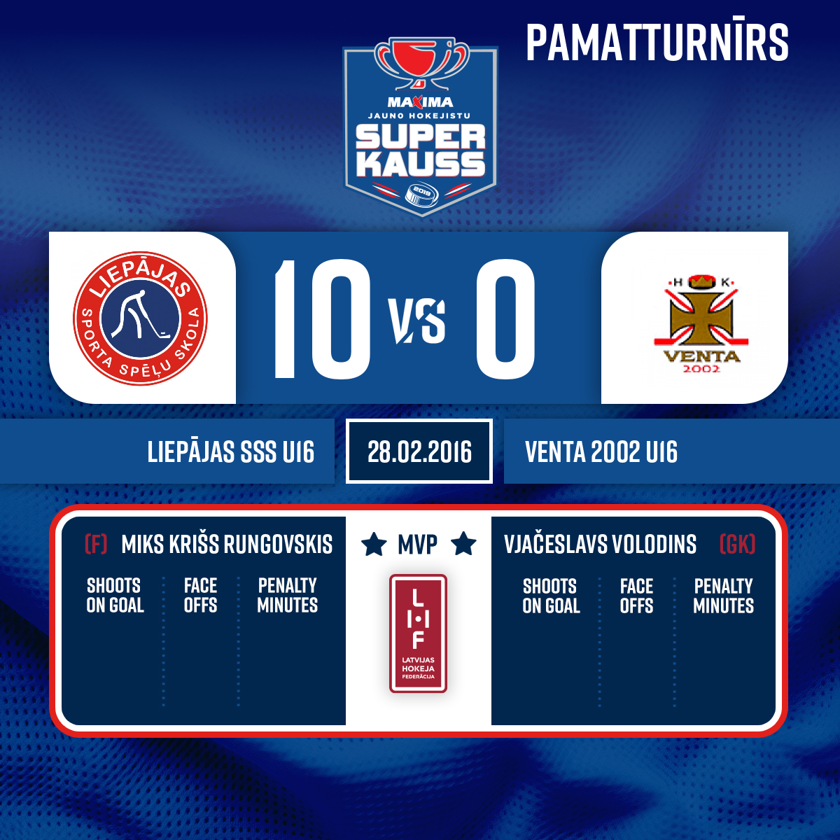 Goal#10 Klāvs Jorens AIGARSAssist: #18 Miks Krišs RUNGOVSKIS - 20:00 Start of the 2nd period