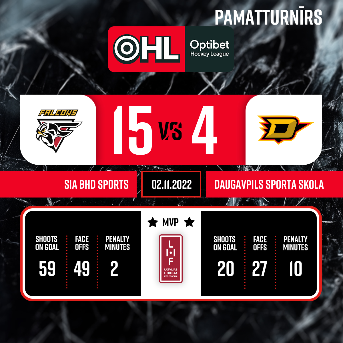 Goal#8 Vadims VABIŠČEVIČSAssists: #4 Daniils ANDREJEVS, #90 Renāts VABIŠČEVIČS - 00:00P1Spēles tiesneši: Galvenie tiesneši- Andrejs Kudrjašovs un Artūrs Artamonovs Līnijtiesneši- Voldemārs Rava un Ņikita Nikolajevs Inspektors- Arnis Bērziņš