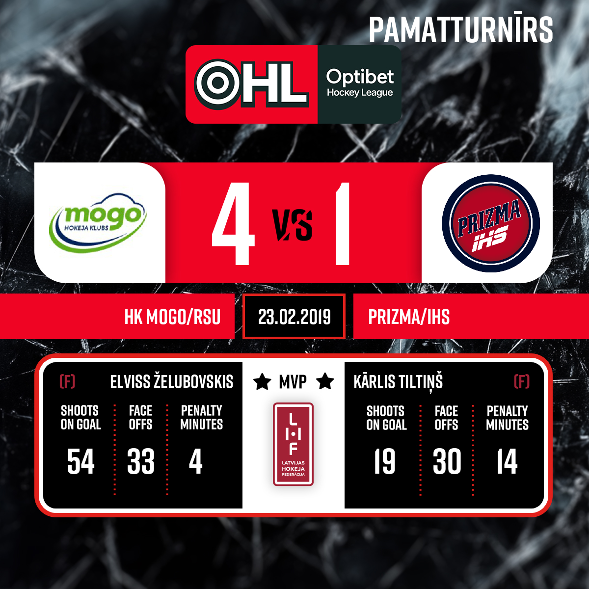 - 60:00P3Spēles labākie spēlētāji : HK Mogo - Elvis Želubovskis #17 HK Prizma - Kārlis Tiltiņš #12