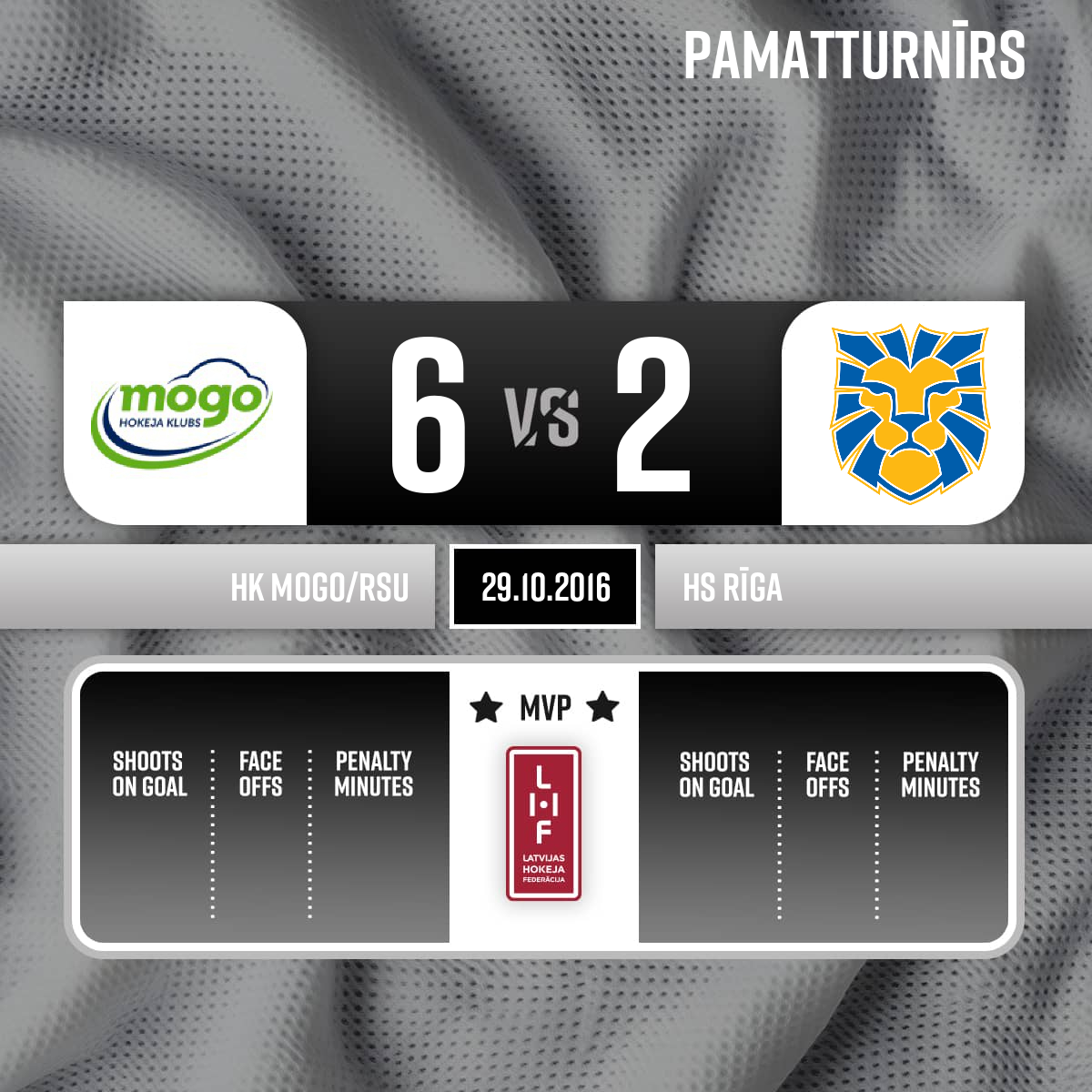 - 60:00P3Labākie spēlētāji: HK Mogo #24 - Sergejs Teluškins HS Rīga #20 - Emīls Ģēģeris