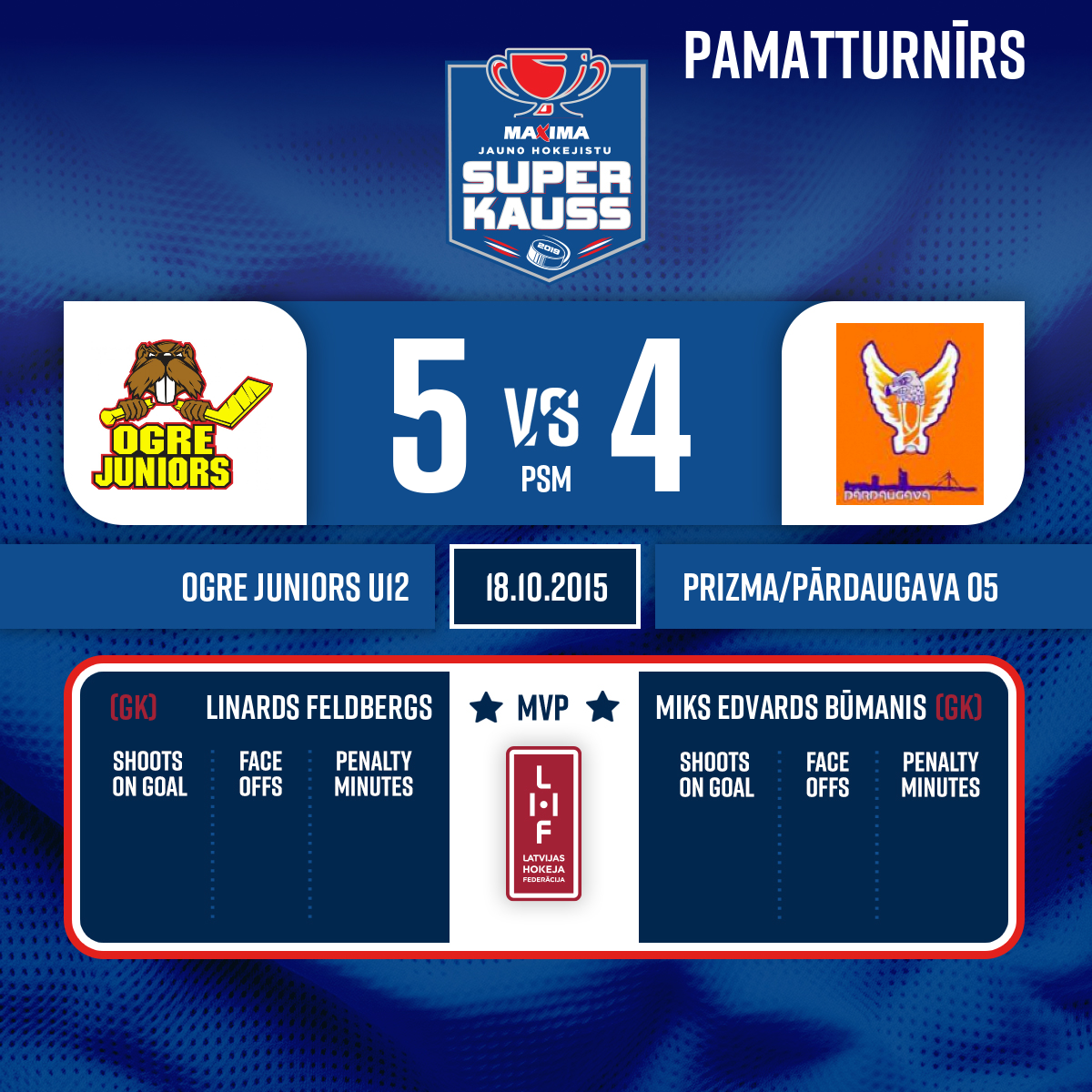Spēles labākie spēlētāji; Ogre juniors #88 Linards Feldbergs; Prizma/Pārdaugava 05 #31 Miks Edvards Būmanis