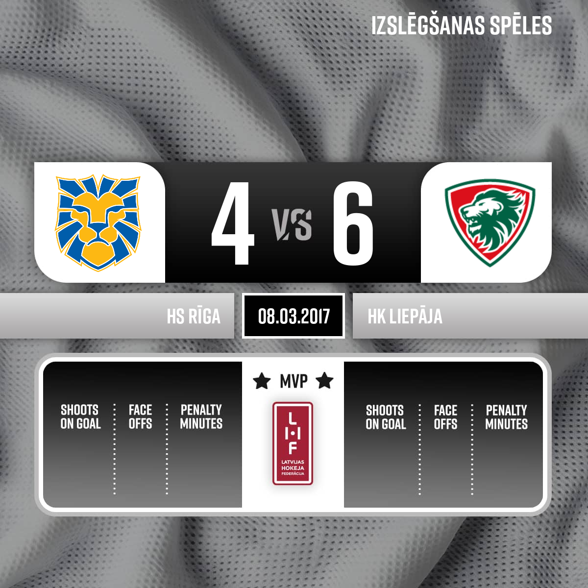 - 20:00P1Metieni: HS Rīga 8 HK Liepāja 16