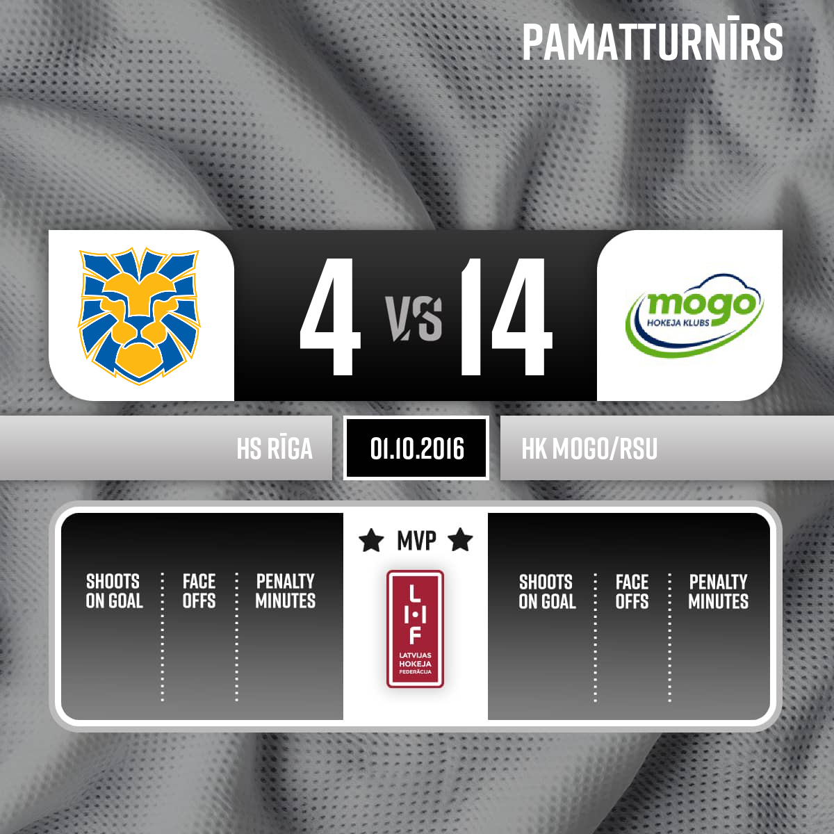 - 60:00P3Labākie spēlētāji: HS Rīga #15 Daniels Riekstiņš; HK MOGO #94 Emīls Potapovs