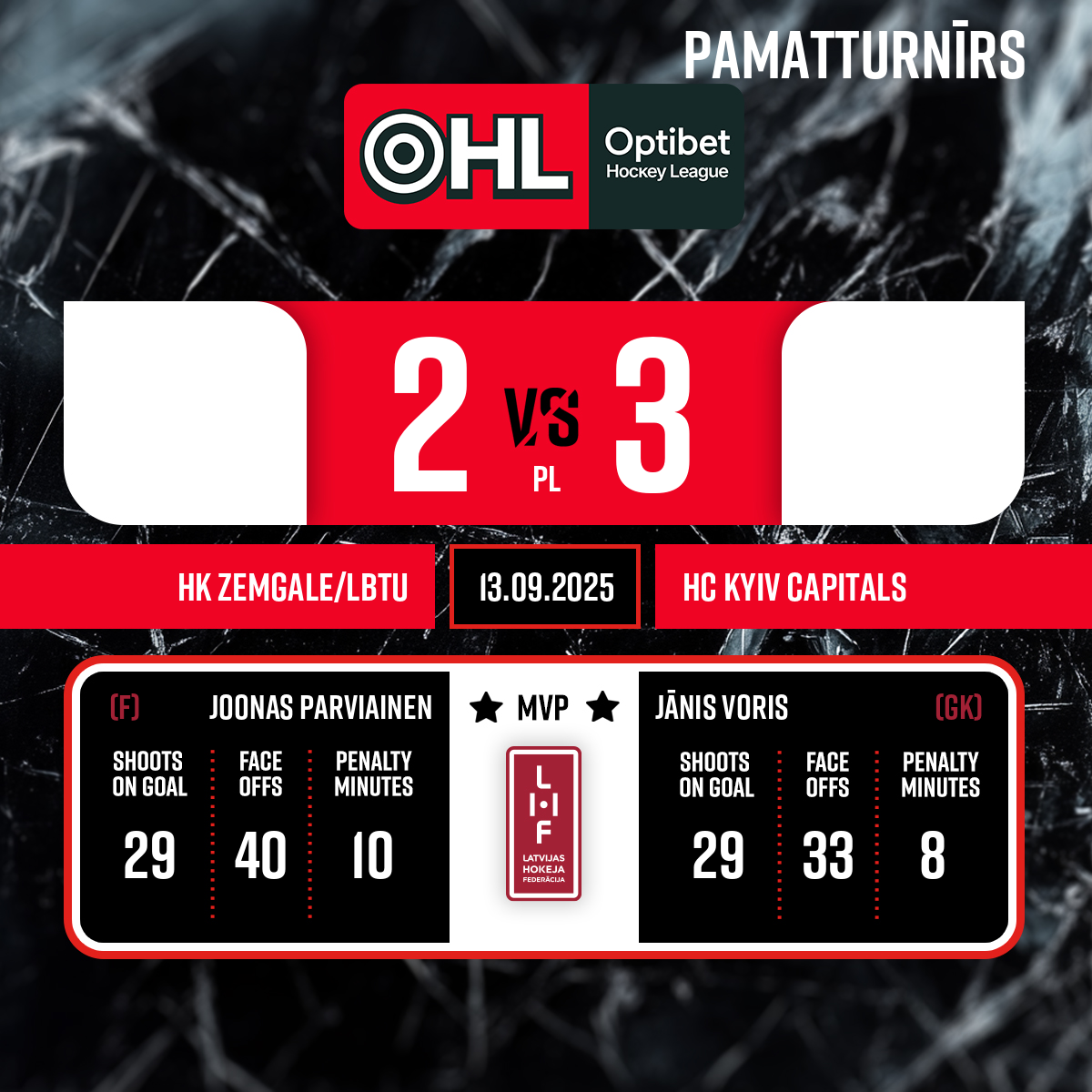 Goal#93 Kristers BRAUNSAssists: #77 Artūrs KARAŠA, #27 Joonas PARVIAINEN - 40:00 Start of the 3rd period