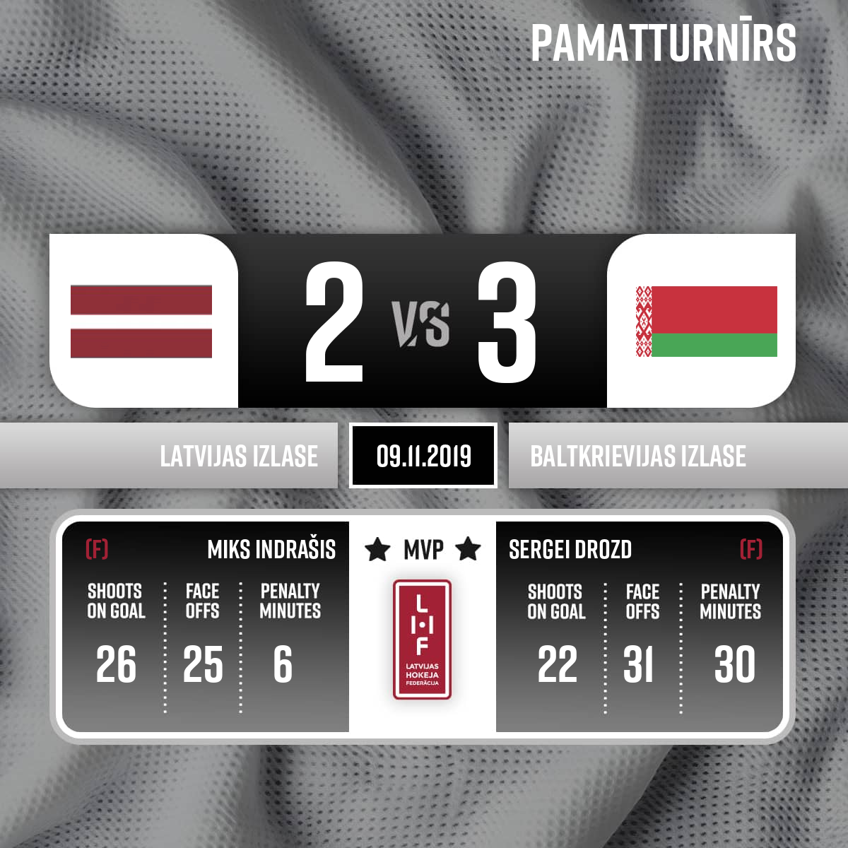 - 60:00P3Labākais spēlētājs Latvijas izlasē / Best player from team Latvia # 70 Miks Indrašis. Labākais spēlētājs Baltkrievijas izlasē / Best player from team Belarus # 13 Sergei Drozd.
