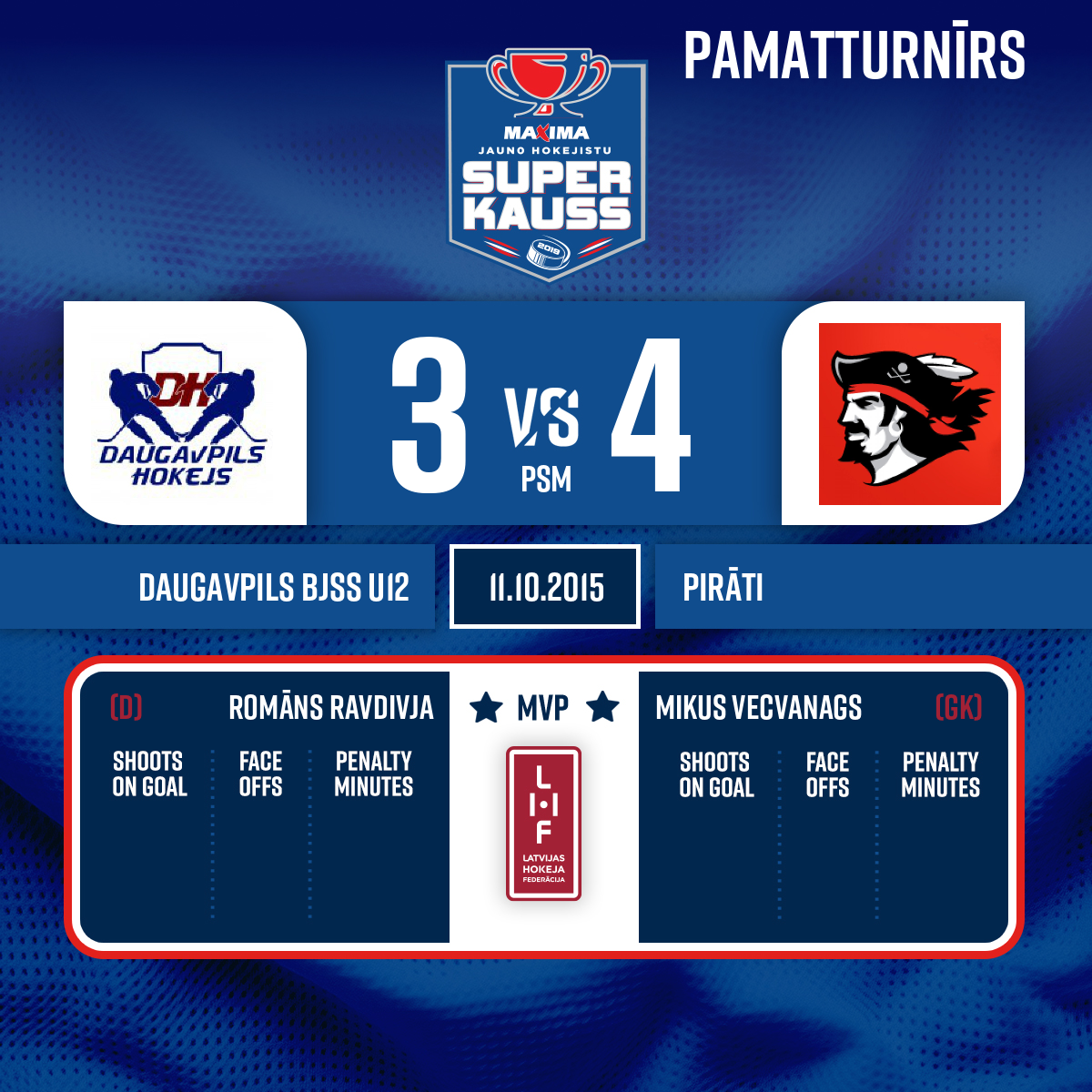 Spēles labākie spēlētāji: Daugavpils BJSS - #14 Romāns Ravdivija, Pirāti - # 30 Mikus Vecvanags.
