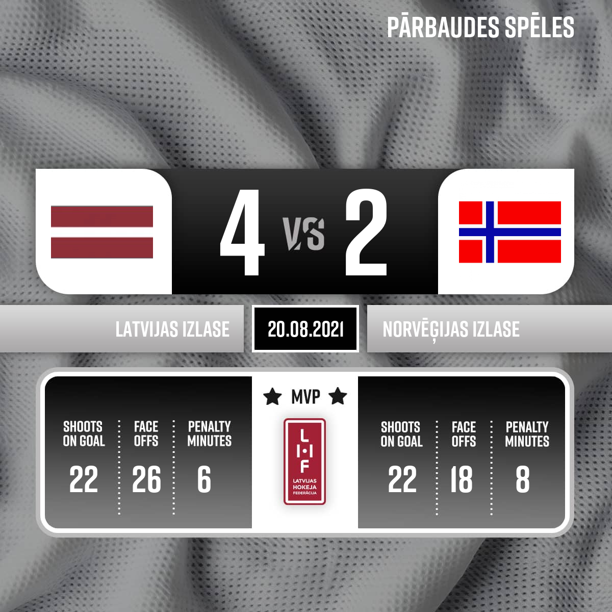 - 60:00P3Spēles labākie spēlētāji: Latvijas izlase - Zemgus Girgensons Nr. 28 Norvēģijas izlase - Eirik Salsten Nr.19