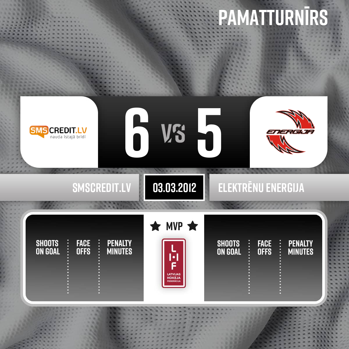 Goal#10 Kārlis ROŽKALNSAssists: #22 Ronalds CINKS, #16 Andrejs MASLOVSKIS - 00:00P1Spēles sākums 19:30