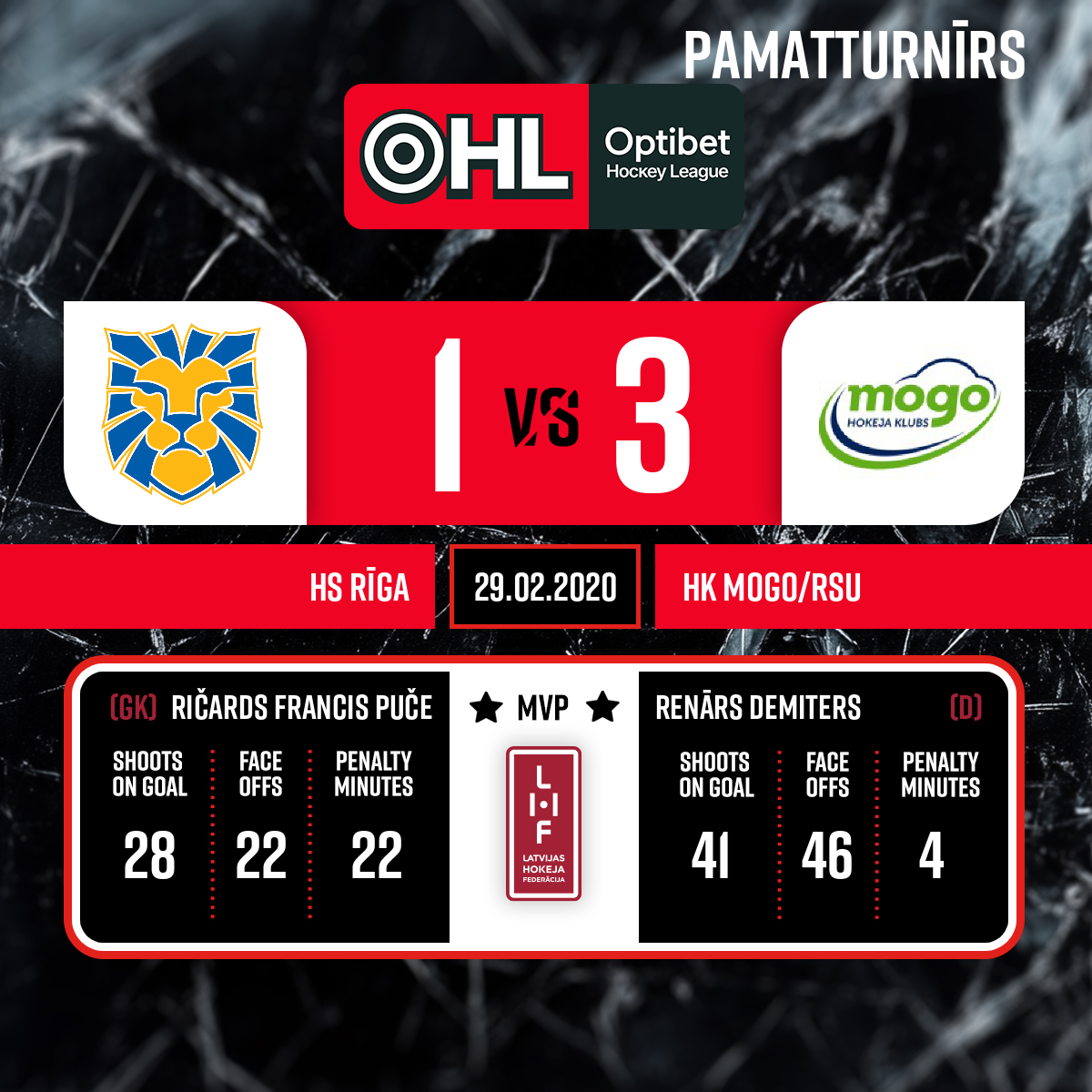 Spēles labākie spēlētāji: HS Rīga - # 31 Puče Ričards Francis HK MOGO - # 72 Demiters Renārs