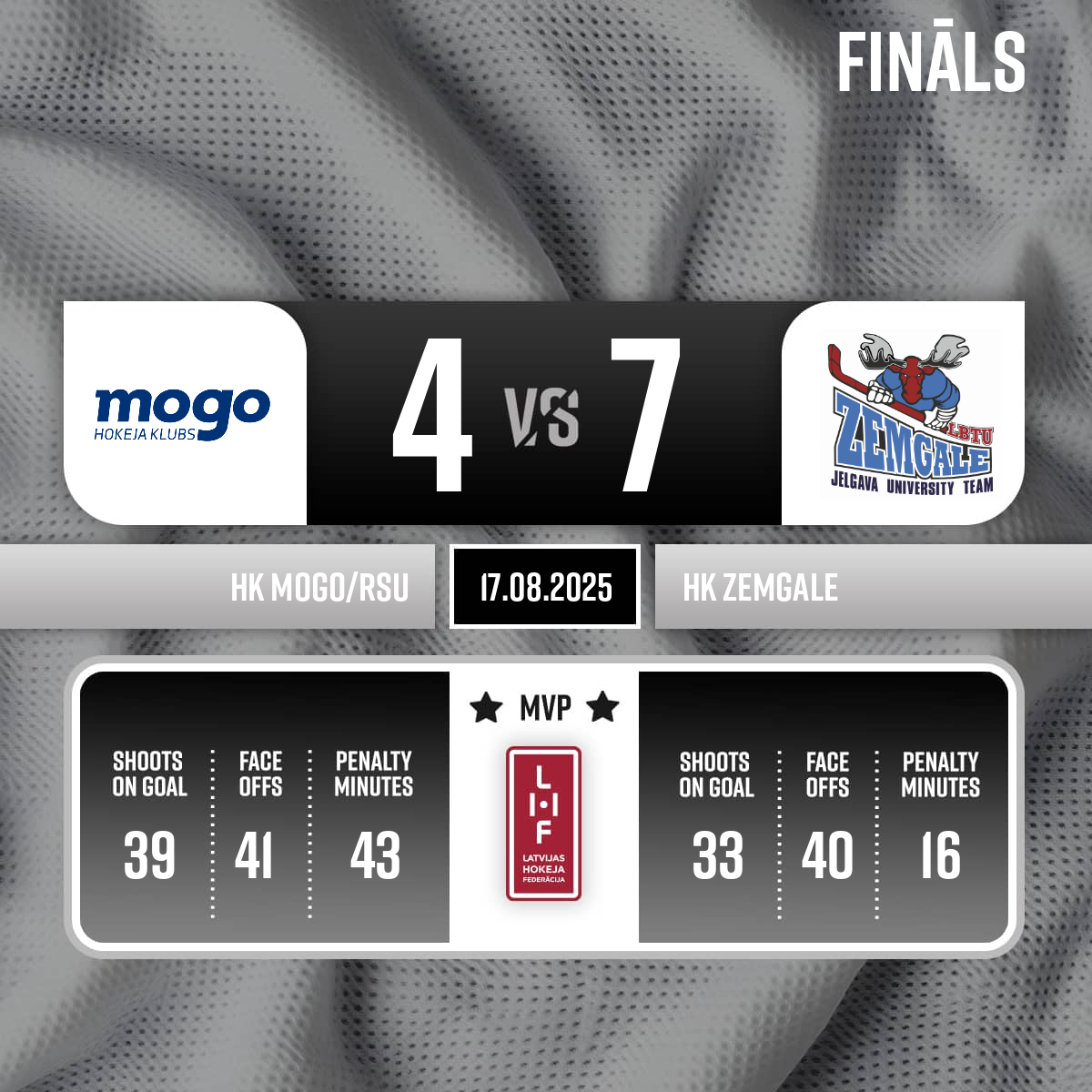 - 60:00P3Labākie spēlētāji: HK MOGO/RSU – Nr 44 Gatis Sprukts HK Zemgale/LBTU- Nr 97 Ričards Bernhards