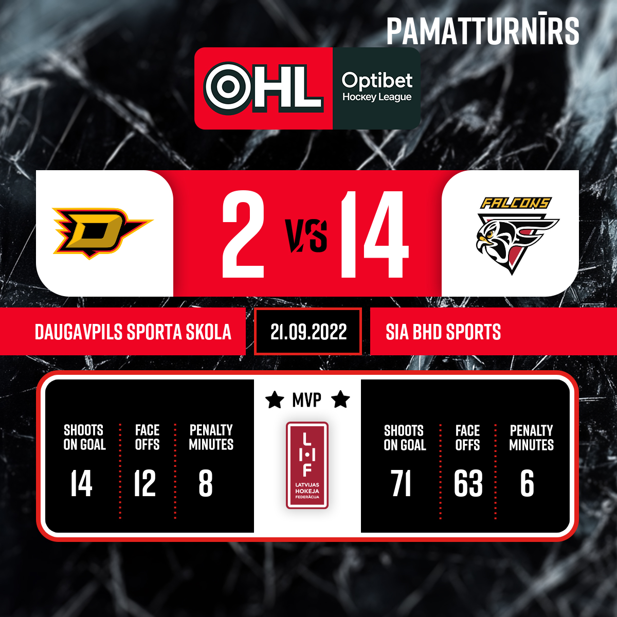 Noraidījums - 2 minūtesPretinieka turēšana ar nūju, #10 Harijs ŠMITS - 00:001.PSpēles galvenie tiesneši: Artūrs ARTAMONOVS un Emīls DRUSEIKS. Līnijtiesneši: Renārs DAVIDONIS un Kaspars ŠIRINS.