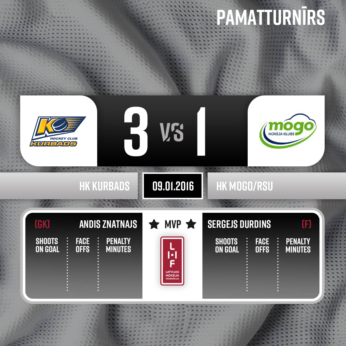 - 60:003.PSpēles labākie spēlētāji: HK Kurbads #43 Andis Znatnajs; HK Mogo #10 Sergejs Durdins