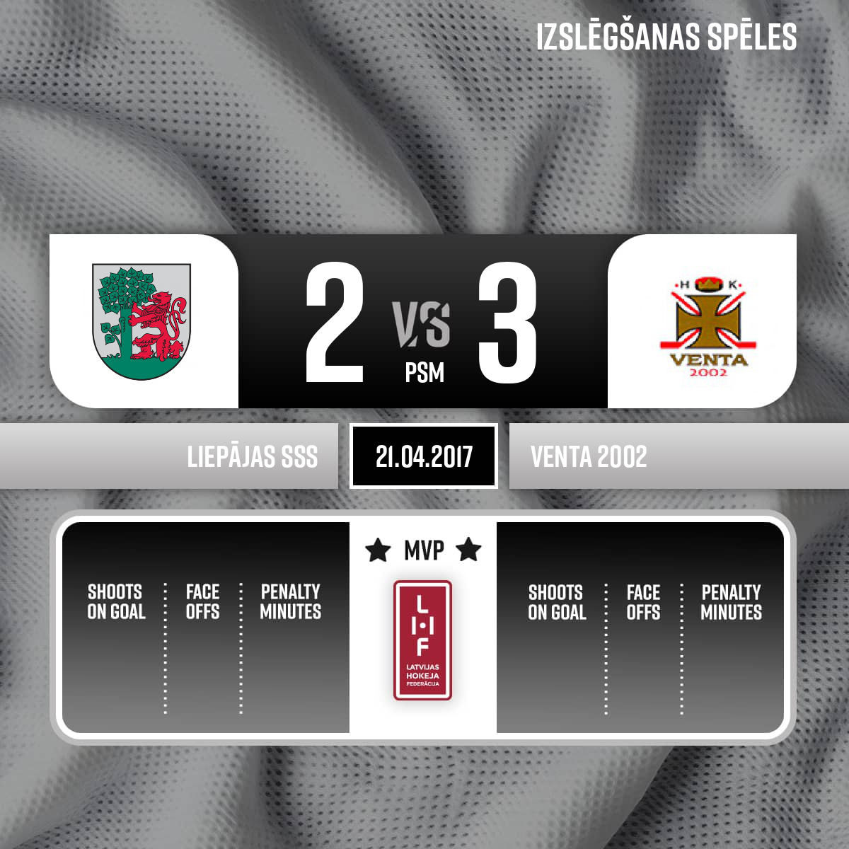 Vārti mazākumā#52 Oskars GRIGULISPiespēles: #12 Rihards Miķelis PĀVELSONS, #28 Oļegs SOROKINS-1 mazākumā - 26:002.P