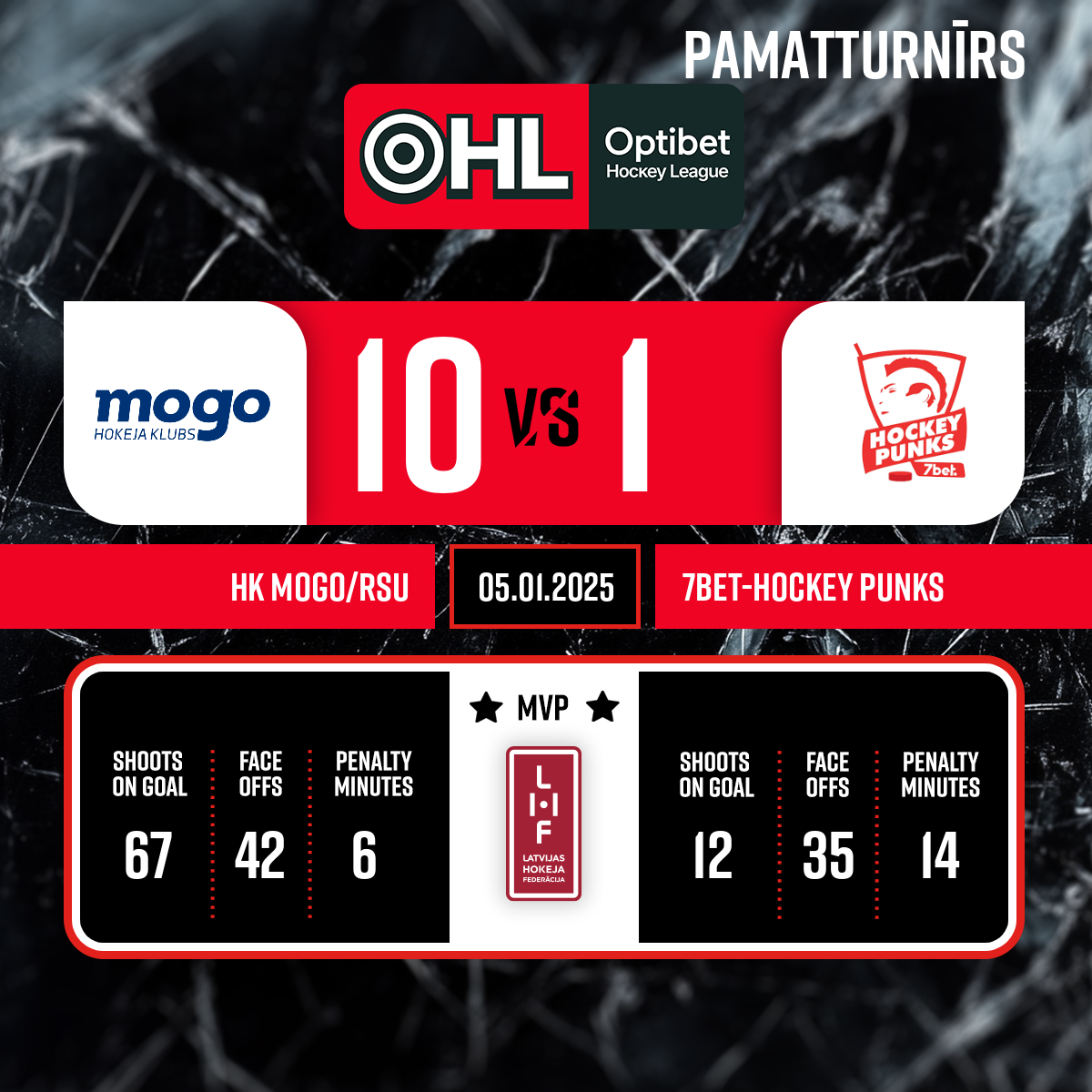 - 60:003.PSpēles labākie spēlētāji: HK MOGO/RSU komandā Nr.87 MEIJA Gints; 7BET Hockey Punks komandā Nr.43 KRUKOVSKI Tomaš