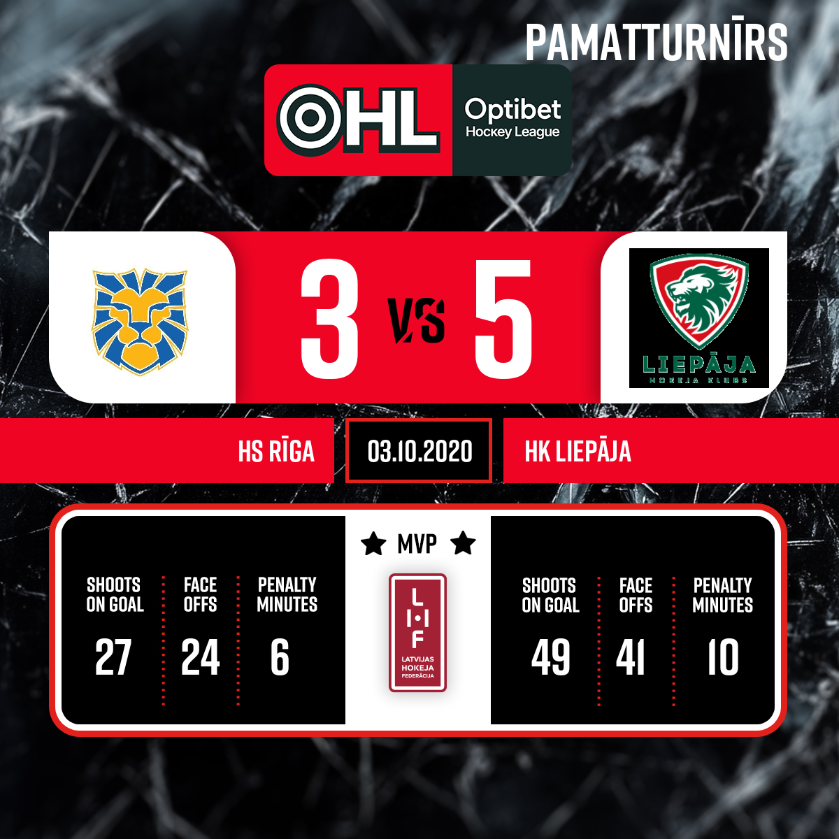 - 60:003.PSpēles labākais spēlētājs komandā HS Rīga #23 PETROVIČS Roberts Spēles labākais spēlētājs komandā HK Liepāja #30 GLŪZDA Mārcis