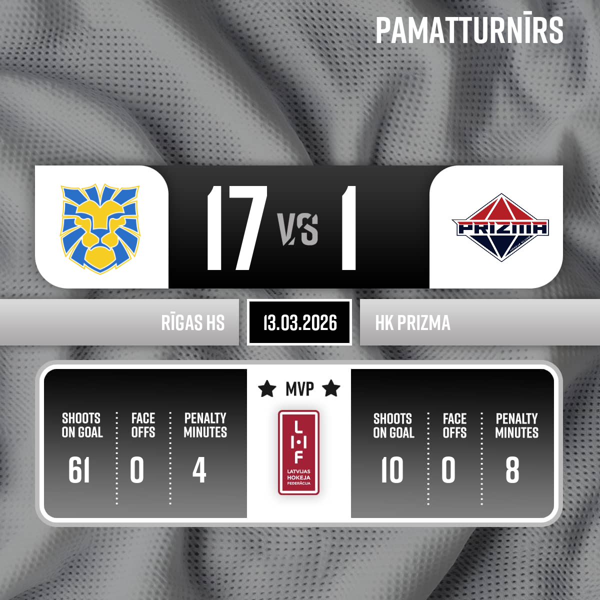 Vārti#13 Dāvids DAŅILOVSPiespēles: #47 Lenards Jānis SPRIESLIS, #49 Valters BERNHARDS