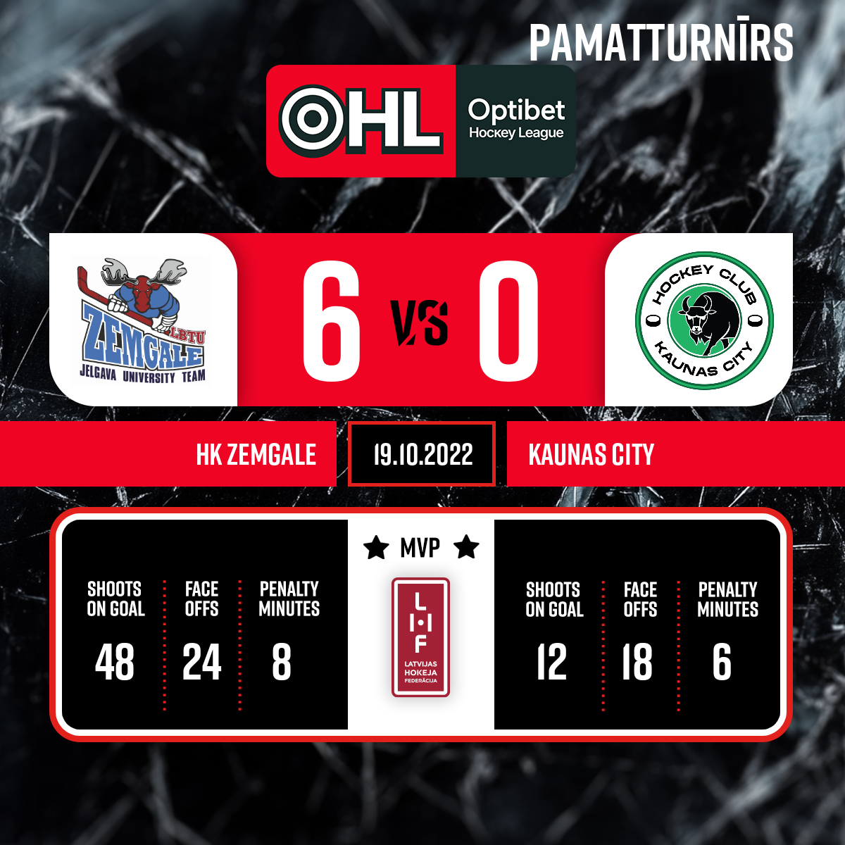 Noraidījums - 2 minūtesPretinieka turēšana ar nūju, #11 Egidijus BINKULIS - 00:001.PSpēles tiesneši- Galvenie tiesneši - Gints Zviedrītis, Viktor Kachan līnijtiesneši- Artem Berehovenko, Raitis Briņecs Spēles inspektors - Juris Laicāns