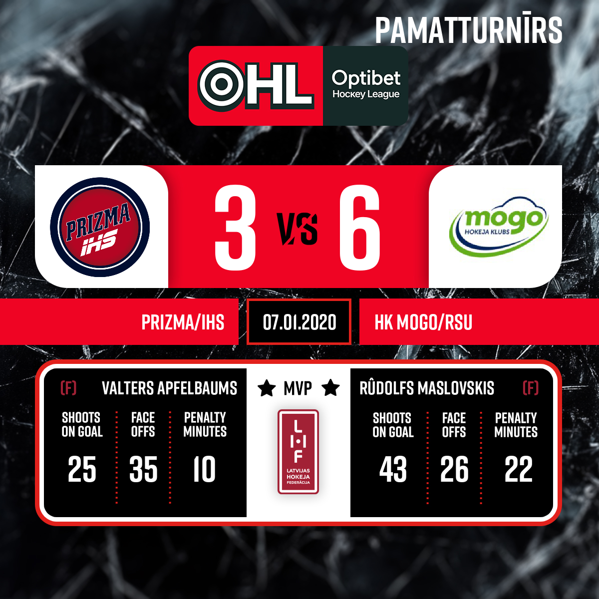 Spēles labākie spēlētāji: Prizma/IHS – #77 Valters Apfelbaums HK Mogo - #21 Rūdolfs Maslovskis
