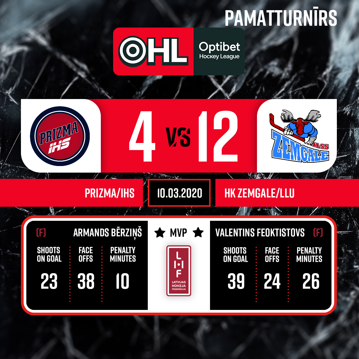 Spēles labākie spēlētāji: Prizma/IHS #21 Armands Bērziņš HK Zemgale LLU # 85 Valentīns Feoktistovs